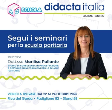 Vi aspetto a Fiera Didacta Trentino 2025 Innovazione, sostenibilità e qualità per le scuole paritarie Dal 22 al 24 ottobre 2025 sarò presente alla Fiera Didacta Trentino, presso il Padiglione B2 – Stand 58, in collaborazione con AZ Scuola Srl – Arredi per Asili e Scuole. Un appuntamento importante per confrontarci sulle nuove opportunità dedicate alle scuole paritarie e costruire insieme percorsi di crescita e innovazione. Durante la fiera terrò una serie di incontri tematici dedicati a dirigenti e gestori di scuole paritarie, con focus su: • Innovazione e Finanziamenti per le Scuole Paritarie Come sfruttare al meglio le risorse del PNRR, FESR e FSE+. • Aprire e gestire una Scuola dell’Infanzia Paritaria Dalla visione alla realizzazione: modelli organizzativi e requisiti di qualità. Vi aspetto al Didacta di Trento! Sarà l’occasione per incontrarci, confrontarci e costruire insieme il futuro delle scuole paritarie.
